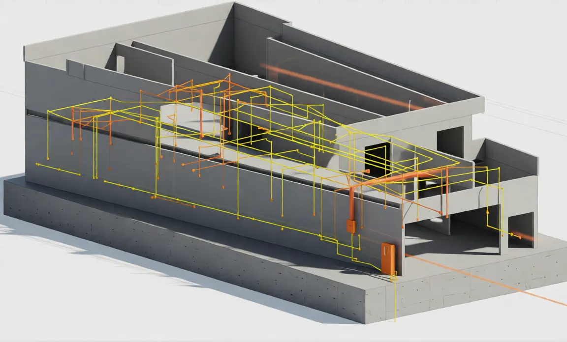 Nossos projetos representa um modelo tridimensional complexo onde aplicamos a metodologia de compatibilização BIM (Building Information Modeling), garantindo que as instalações prediais e a estrutura ocupem espaços harmoniosos, eliminando interferências (clashes) antes que a obra comece, o que reduz drasticamente custos extras e atrasos.